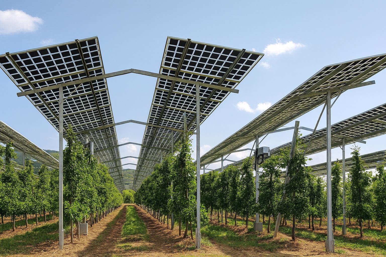 Modern agrivoltaic farms use a suite of innovations. Mounting systems vary: some sites raise fixed racks to human height, others use single or dual-axis trackers that tilt panels east-west (synchronizing with the sun) or flip panels vertically when needed. For instance, Cornell researchers used single-axis tilting panels to follow the sun over a potato field, reducing panel heat stress news.cornell.edu. France’s startups (Sun’Agri) have built dynamic trackers for vineyards that adjust angles daily. Vertical or semi-transparent panels are also explored: by placing panels on their sides (like hedges) between crop rows, more light passes through gaps, and panels collect radiation on both faces (bifacial PV). A recent study found such vertical arrays could limit crop area loss to <20%, making combined wheat+solar more profitable than wheat alone.